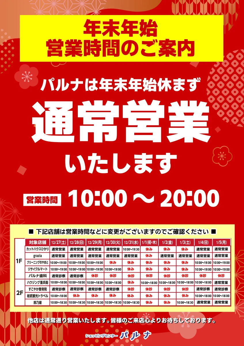年末年始営業時間変更のお知らせ